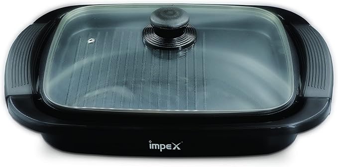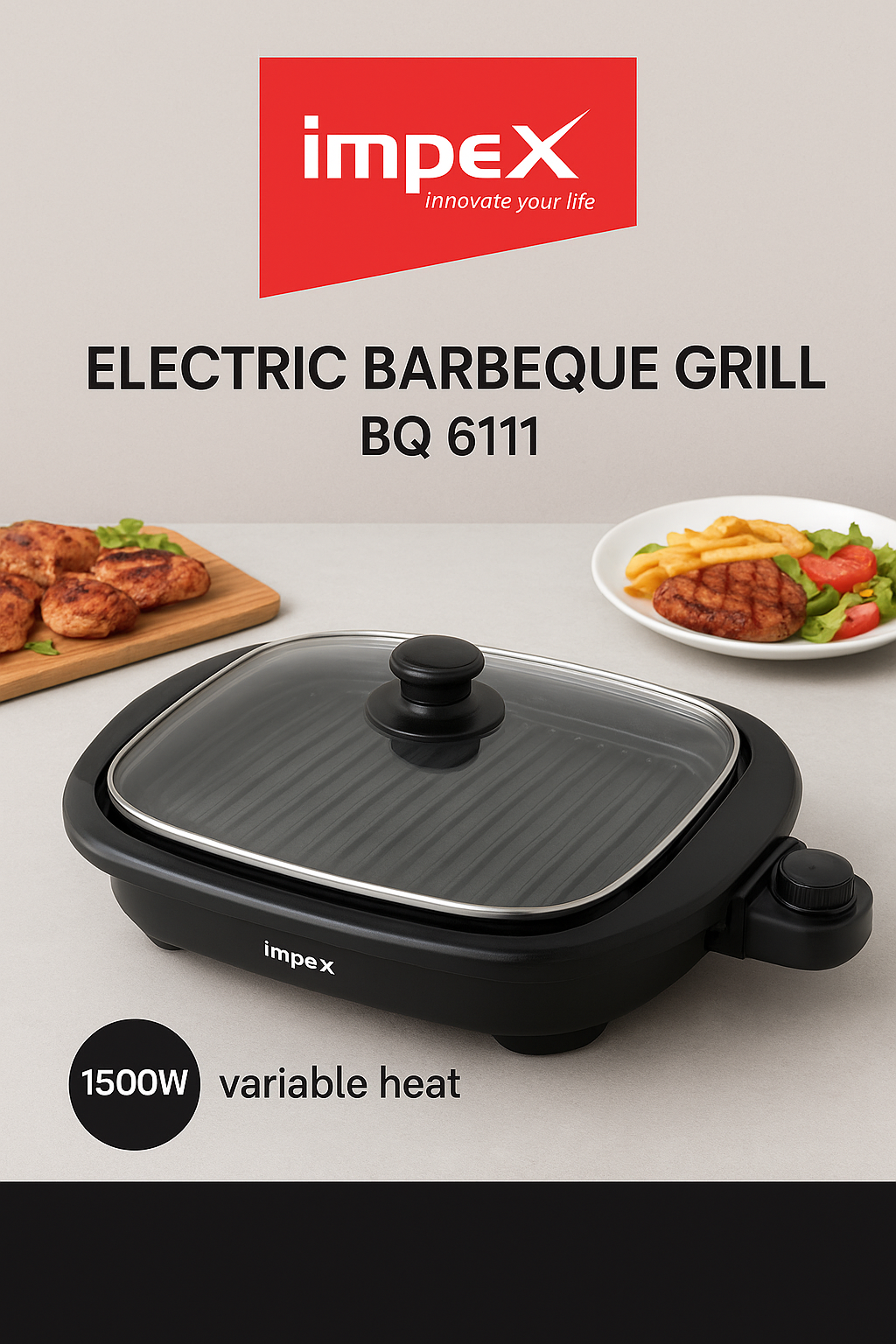 Enjoy healthier, oil-free grilling at home with the Impex BQ 6111 Electric Barbeque Grill. Equipped with a 1500W heating system, non-stick coated grill plate, tempered glass lid, and adjustable heat settings, it delivers fast, convenient, and delicious cooking for meats, vegetables, seafood, and more.